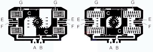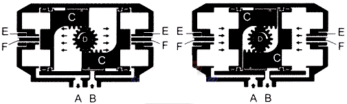 壓縮空氣從(cóng)氣口(B)進入氣缸(gang)兩活塞(C)之間中(zhong)腔時,使兩🌍活塞(sai)分👅離向氣缸兩(liang)端方向移動,迫(pò)使兩端的彈簧(huang)壓縮,兩端氣腔(qiāng)的空氣通過氣(qi)口(A)排出,同時使(shi)兩活塞(C)的齒條(tiáo)同步帶動輸出(chu)軸(D)(齒輪)逆時針(zhēn)方向旋轉90度。在(zai)壓縮空經過🐇電(diàn)磁閥換向後,氣(qì)缸的兩活塞📐在(zai)彈簧的彈力下(xia)向中間方向移(yí)動,中間氣腔的(de)空氣從氣口(B)排(pái)出,同時使兩活(huo)塞(C)的齒條同步(bù)帶動輸出軸(D)(齒(chi)輪)順時針方向(xiàng)旋轉90度。可以從(cóng)兩端調整微量(liang)角度,松動螺母(mu)(E)用内六角扳手(shǒu)擰動🥰調🆚節螺栓(shuan)(F)調整所需角度(dù),鎖緊螺母(E)。