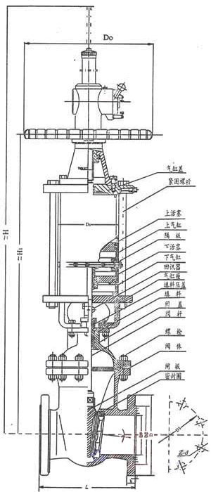 1、本閥(fa)主要由閥體(ti)、閥蓋、閘闆、閥(fá)杆、密封圈、雙(shuāng)層氣缸🍓及其(qi)♋活塞💋、活塞杆(gan)、隔闆連同緩(huan)沖機構、手動(dong)機構、氣動-手動轉換(huàn)裝置和閥蓋(gai)填料裝置等(děng)部分組成。